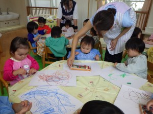 初めはドキドキしていたみんなだけど、先生とのお話や、明るい表情で緊張もほぐれ、お絵描きを楽しみました。くまやうさぎなど、たくさんの動物を思い思いに描くことができました☆描いた後はみんなで見合いっこ。少し照れながらも、紹介を喜ぶゆり組さんでした☆