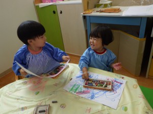 「かしてー」「いいいよ」「いっしょにしよ!」などの言葉が聞こえてきます☆