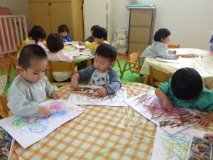 「クレヨンのくろくん」の絵本が好きなゆり組さん。やってみたい!の声から、ひっかき絵に挑戦してみました。黒いところから色がでてくる様子を楽しみながら、思い思いの絵を描いていきました。