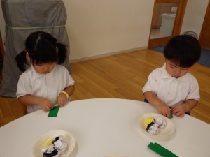 「おにぎりがすき!」「ブロッコリーが食べたい」と始まったお弁当作り。新聞やカラー段ボールなど、いろんな素材を選んでクルクル♪「ハンバーグできた!」「玉子焼き!」と大好きなおかずを詰めていきました。ピクニックごっこが待ち遠しいようです♪