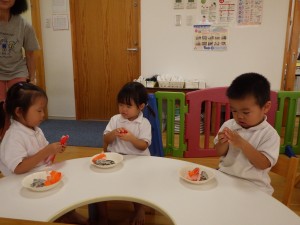 粘土あそびに夢中のばら組さん。新しい粘土は固いけど、しっかりこねて柔らかくなーれ!おいしいのりまきや、ケーキなど、いろんな形を作って楽しみます☆