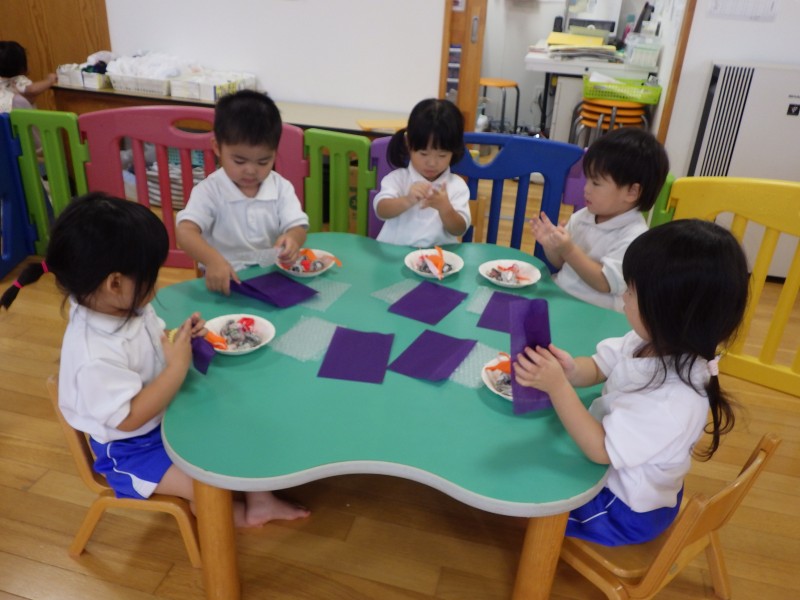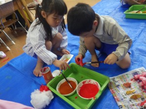 「大きいまるー」「小さいー」と、できる形を不思議そうにみていました。きれいにならべたり、重ねてみたり、紙いっぱいに押しました☆