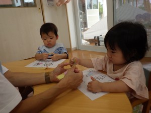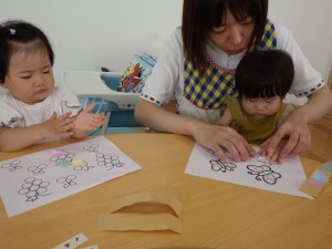 シールを渡すと「ぺったんこ♪」どこにはろうかな?と、手を動かして楽しんでいました☆