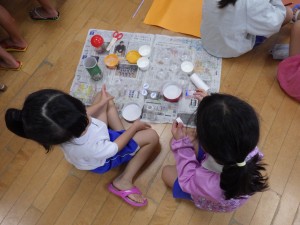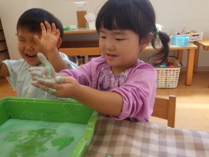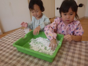 いつもの小麦粉粘土とは違う不思議な感触に興味津々でした。