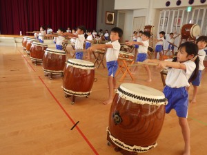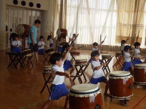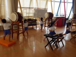 今日は初めての和太鼓!大きな音にびっくりしながらも、叩くことを楽しんでいます。去年のゆり組さんに負けないぞ~!