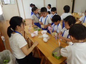 いい天気なので、シャボン玉を楽しみます。自分たちで作ったストローで吹くと・・・。あれれ?「できない~」の声。