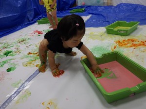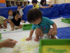 小麦粉でといた絵の具。水で溶いた絵の具とは違う感覚に不思議そうな反応…。足に塗ったり、見つめたり…それぞれに楽しんでいました☆