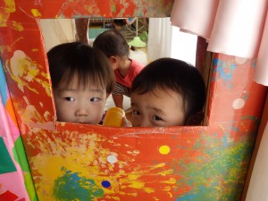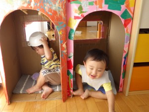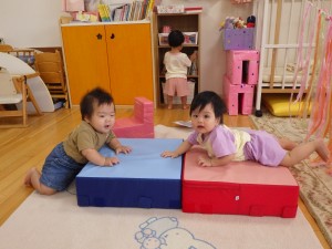 大きな積み木の上にのぼると、お友だちの顔が見えてニッコリ☆