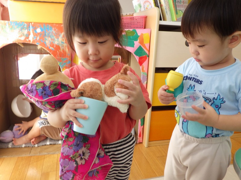 ぬいぐるみにお水を飲ませてあげたり、ご飯を食べさせてあげたり…。トントン♪と、寝かしつけも上手にしています☆
