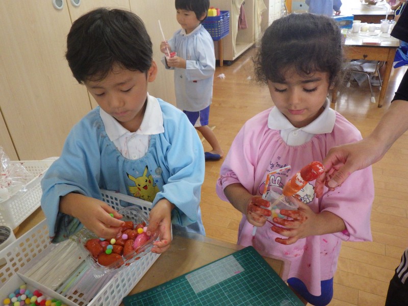 お店屋さんごっこをすることになり、それぞれ作るものを考えています。「チョコバナナかな」「りんご飴!」。